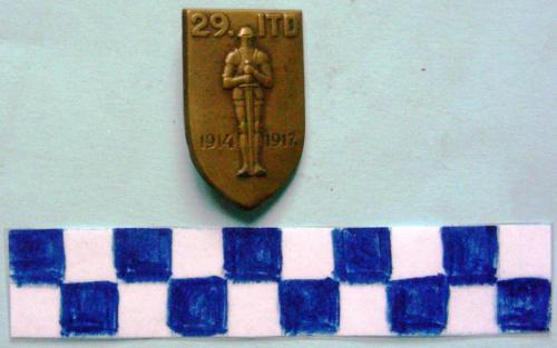 A forma di scudo con al centro in rilievo soldato medievale con elmo ed armatura che stringe una spada a due mani in posizione verticale. Iscrizioni sul recto. Sul verso spilla per il fissaggio ed iscrizione.