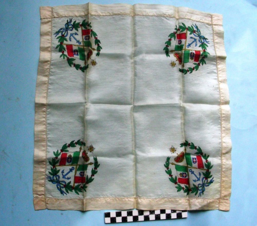 Tela rettangolare a stampa policroma. Orli con punto a giorno. Ai quattro angoli 2 bandiere tricolori con aste incrociate sormontate da corona e stella a cinque punte. Ancora di colore azzurrosotto le aste incrociate. Due rami d'alloro uniti da nodo Savoia racchiudono il gruppo. Sul tricolore di sinistra scudo Sabaudo, su quello di destra scudo Sabaudo coronato.