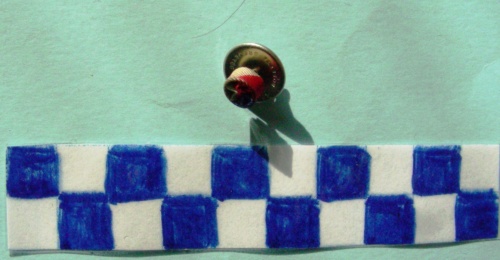 Piccolo cilindro con losanghe di colore bianco rosso e blu, al centro piccola decorazione floreale che riprende gli stessi colori. Nella parte posteriore è presente uno spillo per il fissaggio a pressione al disco del fermo.