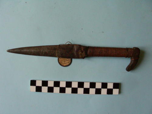 lama a forma di ferro di lancia; impugnatura con rostro a "mezzaluna" sulla coccia rivestita con filo metallico avvolto a spirale.