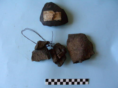 serie di tre frammenti di tegole bruciate e un pezzo di metallo (forse palla di cannone cava all'interno).