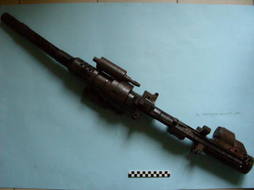 Corpo cilindrico con culatta sfaccettata in cima; canna con fori di aerazione filettata in volata; due cilindri laterali fissati alla cassa mediante due ghiere. Conserva l'otturatore; su tutta la cassa, diversi anelli, alloggiamenti ed attacchi per le componenti mancanti.