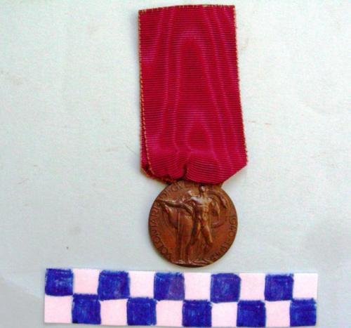 Disco di metallo, sul dritto in rilievo testa dell'Italia turrita volta verso destra . Iscrizioni sulla corona. Sul verso soldato nudo con scudo nella sinistra e braccio destro armato di spada rivolto a sinistra a proteggere una figura di donna velata, iscrizioni lungo la corona. Nastro di colore rosso amaranto.