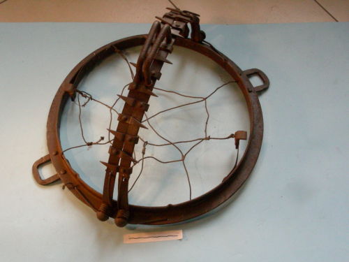 A quindici denti di sega alternati, fissati mediante rivetto alle due morsette. Meccansimo a molla, innesco a rete. Presenti due anelli laterali di fissaggio al suolo e due manici al vertice dei morsetti.