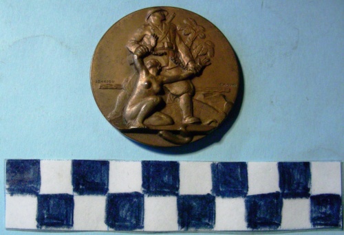 Di forma circolare. Sul recto, al centro, in rilievo, un soldato coloniale in piedi a destra nell'atto di schiacciare con il piede sinistro una serpe e di spezzare le catene che legavano i polsi di un'indigena seduta e nuda. In secondo piano due palme e paesaggio desertico. Iscrizioni a sinistra e destra della figura. Sul verso, al centro, in rilievo lupa capitolina su fascio littorio nell'atto di allattare i gemelli. Trionfo di bandiere in secondo piano. Iscrizioni sopra la figura.