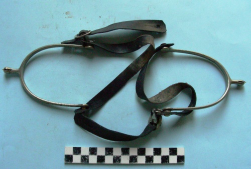 Di forma semiellittica, con due bracci terminanti con un perno sui quali sono fissati due laccioli, quello superiore con fori e fibbia per la regolazione e quello inferiore con fori di fissaggio. Al centro dell'arco gambo a goccia che alloggia una rotellina dentata fissata con un rivetto invisibile dall'esterno.