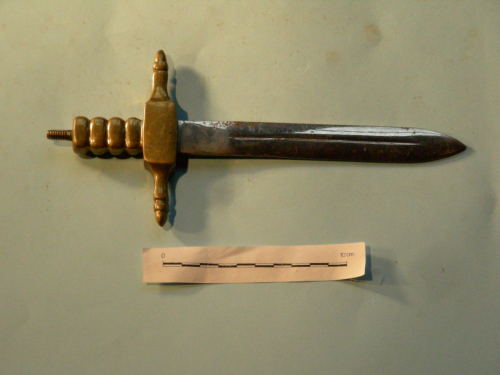 A forma di daga della Guardia Civica ottocentesca, con lama a punta centrale e sguscio centrale, a due fili, guardia a due rami terminanti con ghiande, impugnatura scanalata terminante in incastro a vite.