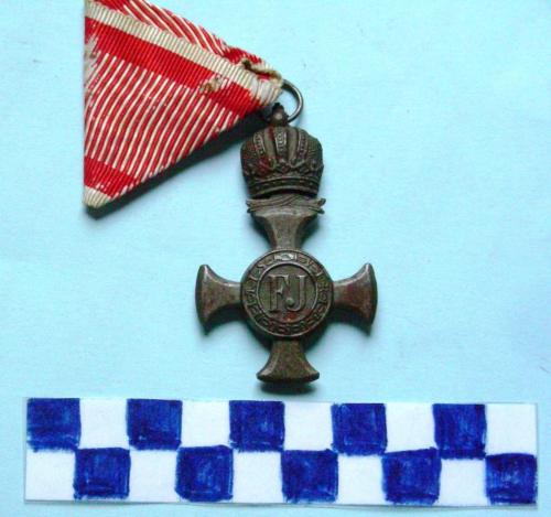 A forma di croce patente, con al centro un medaglione con monogramma e contornato da cornice circolare con iscrizione. Sul verso, al centro un medaglione con iscrizione e cornice circolare decorata con corona d'alloro. Al centro del braccio superiore la corona imperiale sormontata da una maglietta. Nastrino ripiegato a formare un triangolo con strisce rosse di diversa larghezza su fondo bianco.