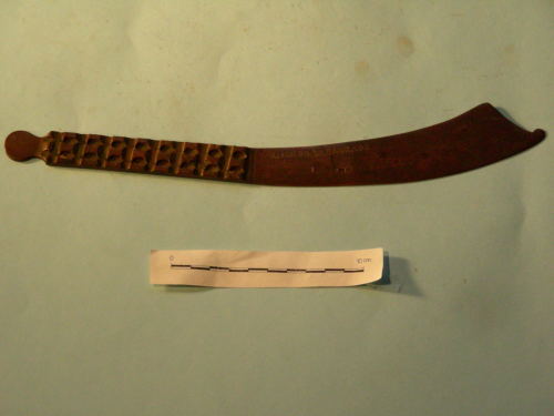 Lama curva, a forma di scimitarra; impugnatura terminante a bottone.
