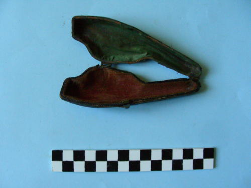 astuccio bivalve con cerniera in metallo e chiusura automatica, rivestito esternamente da pelle, internamente da seta di colore verde (sopra) e vellluto di colore rosso (sotto).