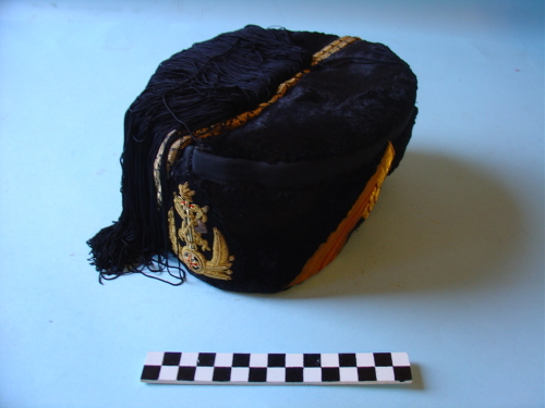 Calotta ovoidale, rigida; bombato, con leggera curvatura al centro del cupolino, in senso longitudinale; risvolto bordato. Fiocco nero e doppio cordone dorato, screziato di nero e intrecciato fissati sulla curvatura del cupolino. Fregio in posizione frontale, gradi di Maggiore sul lato sinistro. Interno rivestito, di colore bianco.