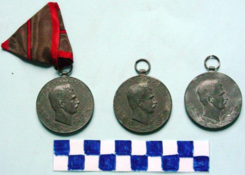 Di forma rotonda. Sul recto profilo dell'imperatore, in rilievo a destra, con iscrizione superiore e due rami d'alloro nella parte inferiore. Sul verso un'iscrizione Nastrino ripiegato a formare un triangolo con strisce rosse su fondo grigio.