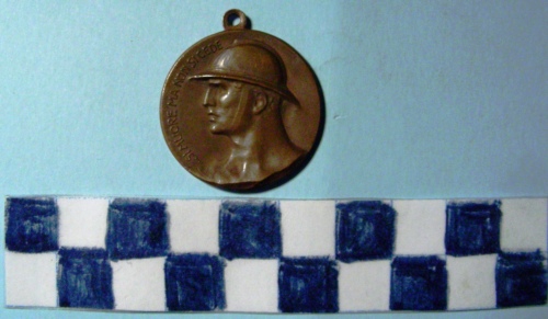 Di forma circolare. Sul recto, al centro, in rilievo busto accollato di fante a sinistra con elmo Adrian. Iscrizione lungo la corona a sinistra. Sul verso, al centro, in rilievo stella raggiante a cinque punte entro ghirlanda d'alloro. Iscrizione al centro.