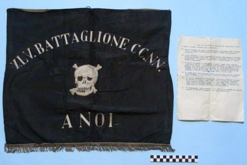 a forma rettangolare. Al recto, tela nera decorata con scritta convessa ricamata color argento, al centro teschio con tibie ricamato color argento, alla base scritta ricamata color argento; canottiglia dorata cucita alla base. Al verso, tela color ocra ed una maglietta al centro del lato superiore.