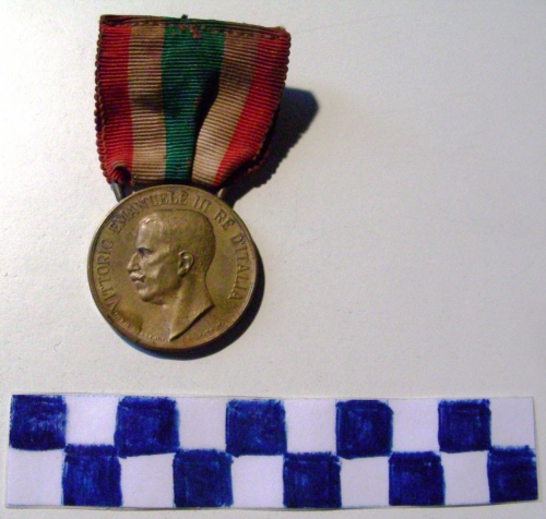 Di forma circolare. Sul recto, al centro in rilievo, busto accollato a sinistra di Vittorio Emanuele III. Iscrizioni lungo la corona. Sul verso, iscrizioni entro corona d'alloro e parte inferiore. Nastrino con i colori rosso e bianco ripetuti due volte con striscia verde di maggior larghezza al centro.