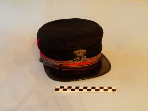 Corpo di foggia bassa, circolare, in panno nero, fascia rossa sul bordo inferiore sormontata da due "giri" in filo d'argento, visiera, fregio frontale della Guardia Nazionale sormontato da corona, tre profili rossi verticali, soggolo fissato alle tempie con due bottoni. Interno foderato di raso viola, fascia interna.