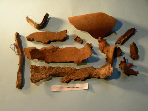 Dodici schegge di forma irregolare; una di esse è costituita da un frammento di corona di forzamento; un'altra di esse conserva la verniciatura originale.
