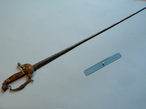 Lama dritta, a due fili, sezione a losanga. Incisioni al cesello visibili fino a poco sopra il tallone. Punta simmetrica al centro. Fornimenti dorati; guardia a pelta terminante con due teste di leone; cappetta recante al dorso il bottone a cui si inserisce il codolo della lama, ribattuto, e termina con una testa umana sul cui mento si inserisce il ramo di guardia, decorato a motivi vegetali e con mascherone e sdoppiato al raccordo con la traversa. Il ramo di parata termina con una testa di animale stilizzata. Impugnatura a due ghiere cui è stato saldato un elemento in ferro probabilmente per inserire l'arma in panoplia.