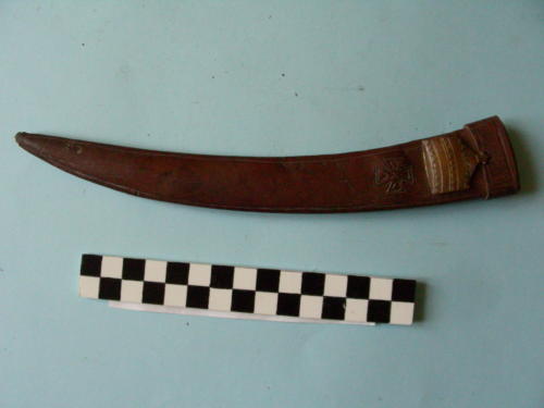 in cuoio, rivestito in pelle naturale (marocchino) rosa. Reca incisa una croce copta, sormontata da una applique a forma di corona, simbolo etiope, in metallo. La cappa è rinforzata con un anello di cuoio. Cucitura sul retro.
