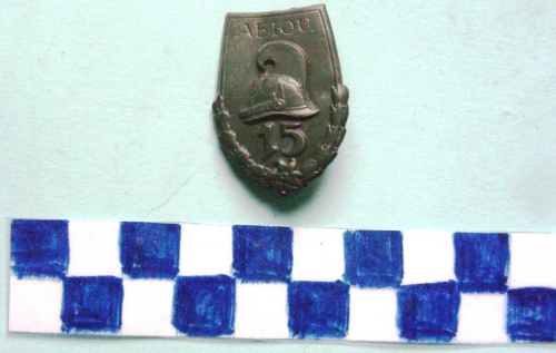 A forma di scudo con parte inferiore decorata con rami d'alloro e stella alpina. Al centro, in rilievo, un elmo di profilo a sinistra. Iscrizioni sul lato superiore e sotto l'elmo Sul verso spilla di fissaggio ed iscrizione.