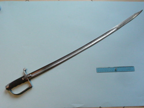 lama civile curva, a filo, punta e controfilo. Ampie sgusciature sui due lati, per i primi tre quarti. Liscia al debole. Punta ribassata alla pandura. Fregi ad acido a motivi militari e floreali su entrambi i lati della lama per la prima metà; motivo floreale anche sul dorso. Guardia a staffa ad un solo ramo; ramo di parata a riccio con spacco per dragona; alette fermafodero rettangolari; cappetta lunga con dorso sfaccettato. Tipico bottone ottagonale avvitato al codolo. Impugnatura zigrinata e sagomata.