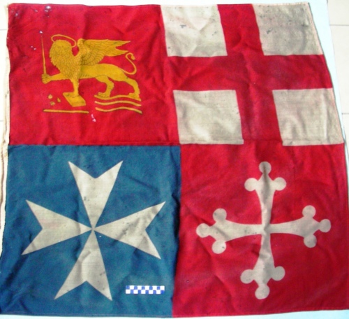 Di forma rettangolare divisa in quattro settori riportanti gli emblemi delle quattro repubbliche marinare. Corda con cappio inserita nell'inferitura. Iscrizione parzialmente leggibile lungo l'inferitura.