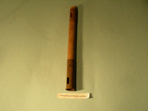 Bastone terminante a parallelepipedo per incastro, con due rinforzi metallici cilindrici, fissati con chiodi, con fori rettangoli per raccordo. Il rinforzo superiore ha il bordo estroflesso ed è vuoto per due terzi.