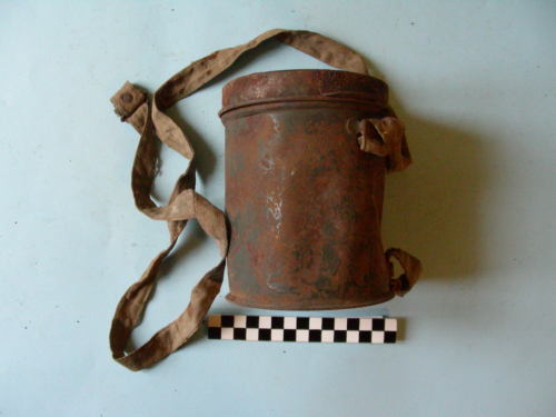 Di forma cilindrica; coperchio basculante con maglietta e linguetta metallica. Due magliette per le cinghie di aggancio, presenti. Un gancio di fermo per il coperchio; all'interno del coperchio, struttura a due fili metallici convessi incrociati.