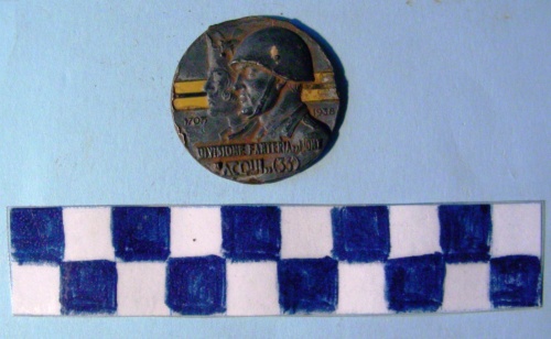 Di forma circolare. Sul recto, al centro in rilievo, busti affiancati a sinistra di due soldati, uno in divisa attuale e uno in divisa antica. Dietro le figure è presente una mostrina orizzontale di colore giallo con banda nera centrale. Iscrizione sotto la mostrina ai lati delle figure e ulteriore iscrizione sotto i busti. Sul verso, stemmi in posizione obliqua affiancati e coronati entro cartigli. Su quello di destra sono raffigurati una croce sovrastante un'aquila rivoltata e spiegata reggente tra gli artigli un animale. Quello di sinistra è diviso in quattro settori. Iscrizione sotto gli stemmi.