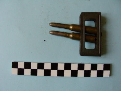 Di forma cilindrica, con fondello e restringimento all'apice del bossolo e proiettile conico. Le due cartucce conservano una piastrina con bande laterali.