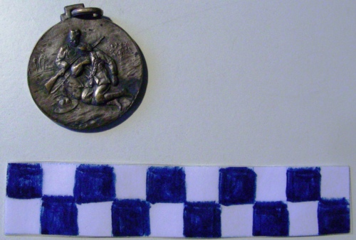 Di forma circolare. Sul recto, al centro, in rilievo un legionario morente a sinistra, assistito da un ascaro con fucile. Sullo sfondo, un tucul e palme. Sul verso, al centro, in rettangolo, un'ala spiegata a destra con sovrastante gladio. Iscrizioni lungo la corona, nella parte superiore, a destra dell'ala e sotto il rettangolo. Anello all'appiccagnolo.
