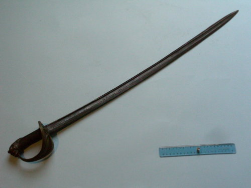 Lama leggermente curva, ad un filo; sguscio fino alla punta; rinforzo al dorso a partire dal primo quarto, punta alla Jelman. Incisioni ad acido fino a metà lama con motivi militari, marini e floreali; motivo floreale anche sul dorso. Fornimento in bronzo dorato. Cappetta a testa di leone con criniera corta. Impugnatura zigrinata.