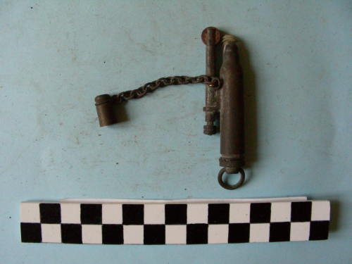 Di forma cilindrica, con anello saldato a un'estremità e stoppino all'altra; ulteriore cilindro con rotella di accensione fissato sul corpo e catenella con cappuccio cilindrico agganciata.
