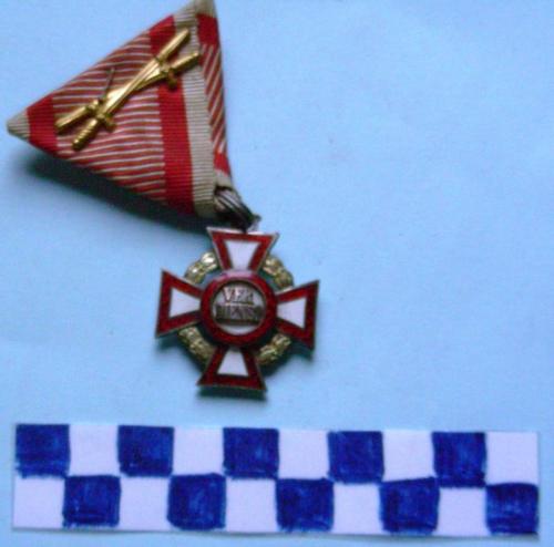 Croce patente d'argento smaltata di bianci e bordata in rosso con una corona d'alloro dorata tra i bracci. Al centro medaglione bianco contornato da anello rosso con iscrizione. Il verso di colore bianco. Nastrino ripiegato a formare un triangolo con strisce rosse su fondo bianco. Sul nastrino sono applicate due daghe dorate incrociate.