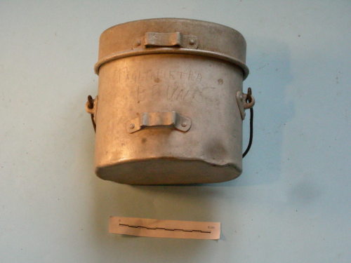 Manico in tondino inserito in due occhielli laterali fissati con rivetti. Coperchio con manico e placca di aggancio. Seconda placca sul corpo della gamella.