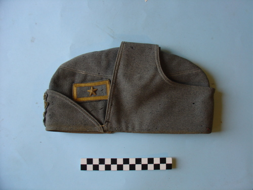 Floscia, con visiera ripiegata sulla fronte e paraorecchi fissati con bottoni automatici sulla sommità. Colore girigio militare. Fregio rettangolare con stelletta a cinque punte indicante il grado, sul lato sinistro; fregio frontale.