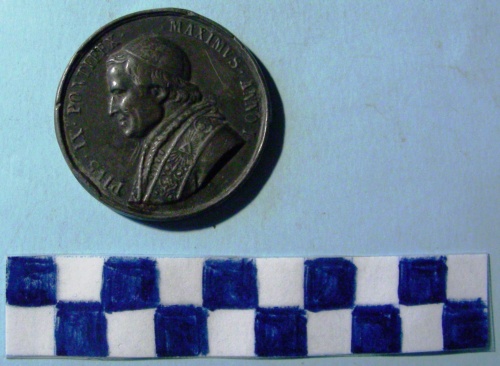 Di forma circolare. Sul recto, al centro in rilievo, busto a sinistra di Pio IX con berretto, mozzetta e stola. Iscrizioni lungo la corona. Sul verso, al centro in rilievo, iscrizione.