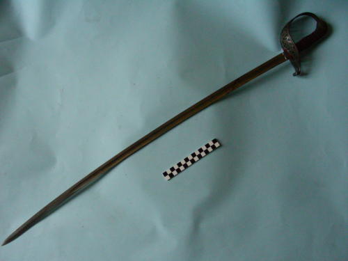 Lama curva, a un filo, punta e controfilo; sguscio centrale per quattro quinti. Punta al centro. Guardia all'austiaca traforata e incisa a volute simmetriche, terminanti in un giglio borbonico stilizzato che qualifica la guardia come pre-unitaria. Il ramo di parata è un prolungamento del piatto di guardia; cappetta lunga arrotondata; la parte superiore è a gradini (tipica). Codolo ribattuto. Impugnatura rivestita, a settori zigrinati, divisi da scanalature; sono presenti le cordelle.