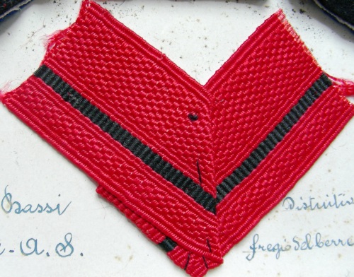 Nastro ricamato di colore rosso con inserita striscia di colore nero ripiegato al centro a formare una "V".