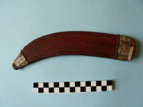 in cuoio, rivestito in pelle naturale (marocchino) rossa. Puntale in pelle bianca. Imbocco rivestito di pelle chiara, forse di coccodrillo. Sottili striscioline decorative in cuoio marrone scuro agli attacchi degli inserti in pelle chiara. Decorato centralmente con incisioni geometriche.