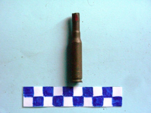 Bossolo di forma cilindrica con fondello e finto proiettile con la punta aperta e resti di vernice rossa.