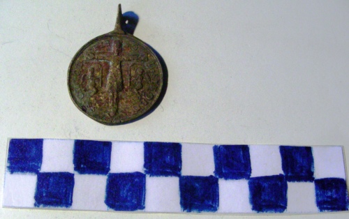 Di forma circolare. Sul recto, al centro, in rilievo il crocefisso di Numana con Cristo vestito da una tunica con ai lati due angeli che reggono un cero. Iscrizione lungo la corona. Sul verso, al centro, in rilievo la Madonna Lauretana, di fronte, rivestita della rituale dalmatica con il Bambino. Iscrizione lungo la corona.