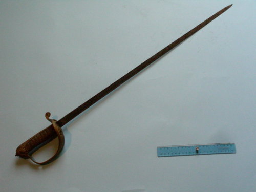 Lama dritta, ad un filo e falso filo; sguscio fino a tre quarti; piatta al debole, punta al centro. L'esemplare presenta la lama montata al contrario. Incisioni ad acido fino a metà lama con motivi militari e floreali; motivo floreale anche sul dorso. Fornimento in bronzo dorato; ramo di parata a ricciolo scanalato sul lato; l'altro ramo del piatto di guardia è ripiegabile. Cappetta a testa di leone, la cui criniera ne copre l'intera lunghezza. Impugnatura di colore naturale (grigio) con cordelline di bronzo dorato.