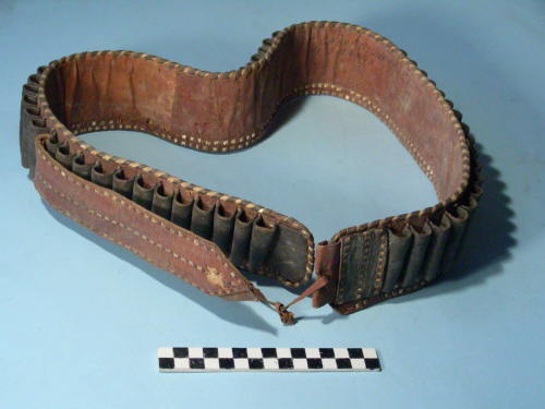 Cinturone terminante con un lacciuolo a sinistra ed un doppio cinturino sovrapposto a destra applicato ad un quarto della lunghezza a coprire parte degli alloggiamenti dei proiettili. Sul cinturone sono cuciti 59 alloggiamenti per cartuccia di pelle nera. Il passante, il cinturino ed il cinturone sono decorati con inserti di pelle di colore più chiaro.
