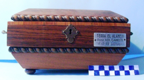 A forma di parallelepipedo con base e coperchio a forma di piramide tronca con le basi decorate a torciglioni. Il corpo centrale presenta due maniglie snodate avvitate alle facce laterali e toppa della serratura in metallo sulla faccia anteriore. Quattro piedini circolari alla base. Targhetta con iscrizione sul lato destro della faccia anteriore. Una etichetta ed un biglietto dattiloscritto sono stati incollati sulla base.