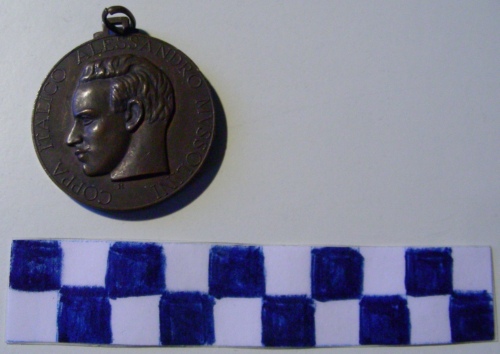 Di forma circolare. Sul recto, al centro, in rilievo busto accollato a sinistra di una figura maschile. Iscrizione lungo la corona. Sul verso, al centro, in rilievo, fascio littorio a destra con iscrizione lungo la corona. Anello all'appiccagnolo.