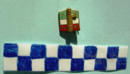 A forma di esagono irregolare con vertice verso l'alto. Il dritto diviso in tre settori in smalto verde bianco e rosso, il tutto con profili dorati con applicato in primo piano un fascio littorio di metallo dorato. Una lettera puntata e dorata nel settore verde e due nel settore rosso. Sul verso una spilla di sicurezza per il fissaggio con iscrizioni ai lati.