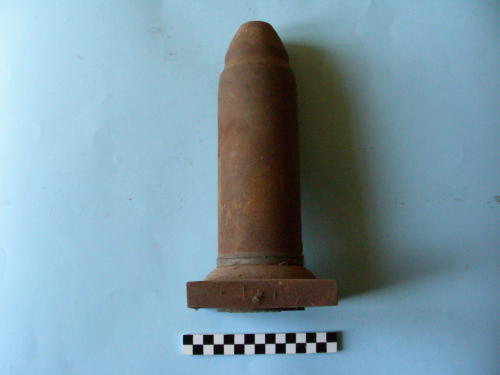 Di forma cilindrica, con corona di forzamento e apice a tronco di cono con due fori e due scanalature per la presa. Al vertice, foro centrale filettato. Montato su base quadrata.