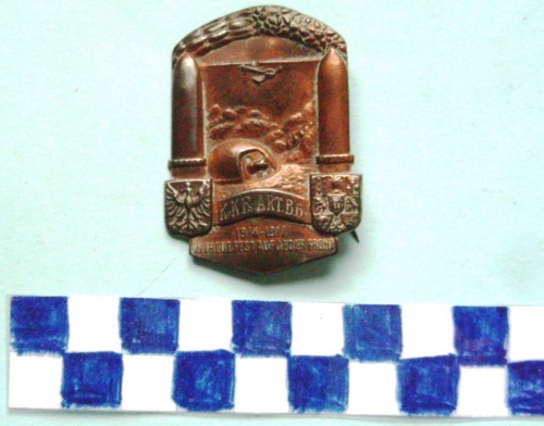 Di forma esagonale, con i lati superiori arrotondati decorati a motivi floreali. Ai lati, in posizione verticale, in rilievo, due ogive con corona di forzamento che poggiano, a sinistra su uno scudo con aquila ad ali spiegate e a destra su uno scudo con stemmi araldici. Al centro, in primo piano, in rilievo, un pezzo d'artiglieria entro una torretta di forma semisferica, in secondo piano un paesaggio montano ed un areoplano in volo verso destra. Nella parte inferiore iscrizioni in un cartiglio e sui lati inferiori. Sul verso, spilla di fissaggio ed iscrizione.