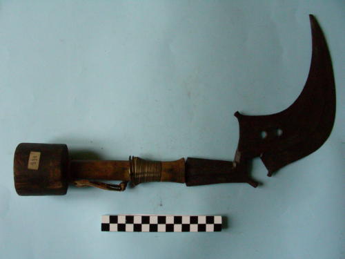 lama a forma "ad artiglio", molto ricurva ed eleborata, tipica di queste armi, con due fori. Impugnatura terminante con ingrossamento cilindrico; ornata con filo dottone arrotolato. Porta ancora il correggiòlo fatto con sottile striscia di cuoio.